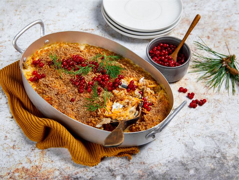 - Voitele laakea uunivuoka ja levitä siihen puolet juuresraaste-ohraseoksesta. Levitä seuraavaksi vuokaan kalafileet ja pirskottele päälle sitruunanmehua. Laita viimeiseksi vuokaan loput juures-ohraseoksesta.
