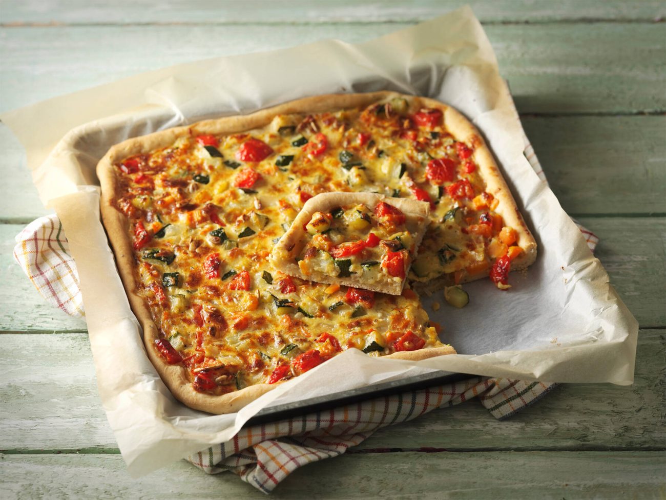 - Valmista täyte. Kuutioi tai suikaloi kasvikset ja paista voissa kattilassa, kunnes ne hiukan pehmenevät. Mausta ja ota kattila levyltä. Lisää kasvisten joukkoon ruokakerma, haarukalla vatkatut munat, siemenet ja juusto. Sekoita hyvin. Levitä täyte taikinapohjalle.