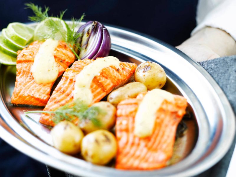 - Leikkaa kalapalat fileen/fileiden paksuimmasta päästä tai osta palat valmiina kaupasta.