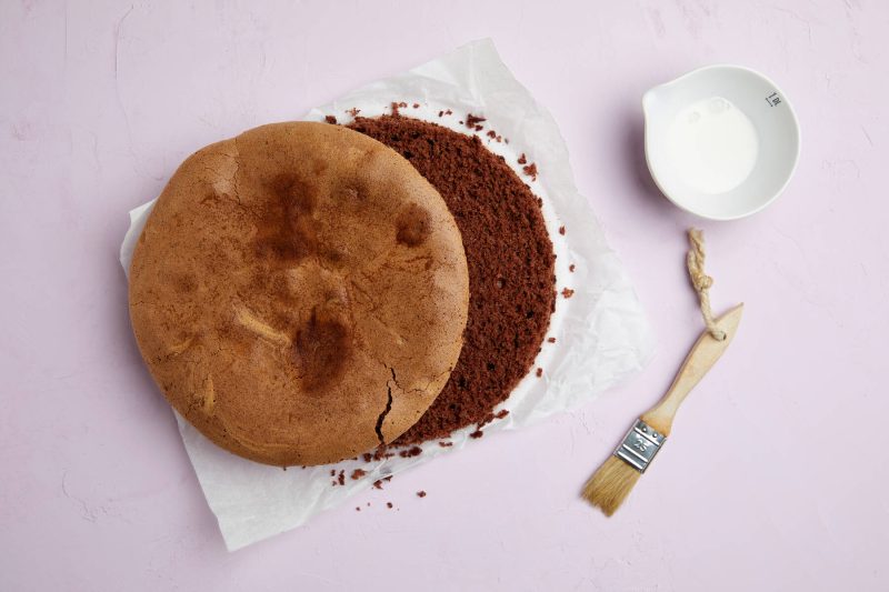 - Kumoa kakku leivinpaperille. Anna jäähtyä kunnolla. Leikkaa jäähtynyt kakku kolmeksi levyksi.