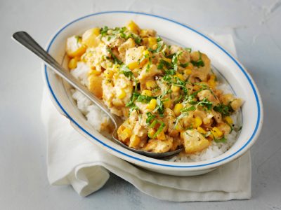 - Sekoita joukkoon vehnäjauhot. Lisää vesi, kanaliemikuutio, currytahna, sitruunamehu, sokeri ja valkopippuri. Anna kypsyä hetki.