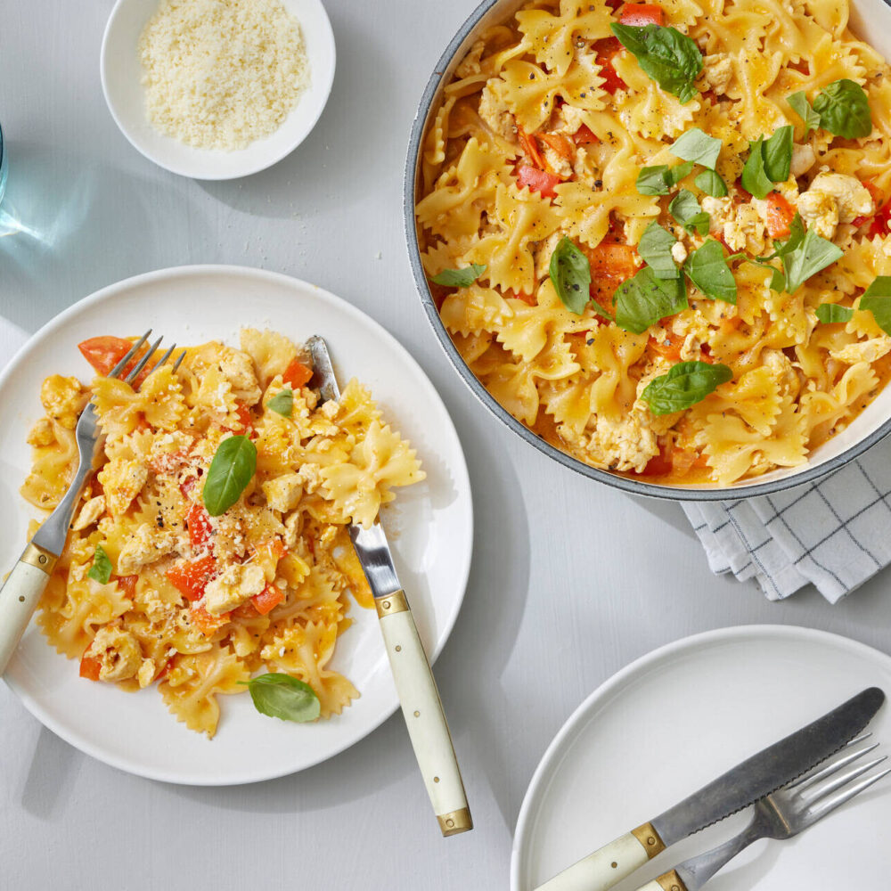 - Sekoita kanakastike ja valutetut makaronin uunivuoassa (n. 20 x 30 cm). Ripota pinnalle käsin murskattuja nacholastuja.