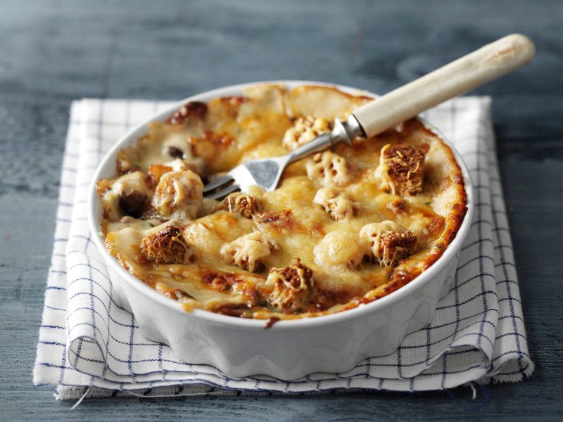 - Laita voideltuihin uuninkestäviin annosvuokiin kerroksittain paahdettuja leipäkuutioita ja sienimuhennosta. Ripottele pintaan juustoraaste. Paista uunissa 200 asteessa n. 20 min tai kunnes paistosten pinta on kauniin ruskea.