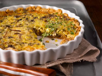 - Kaada täyte pohjan päälle ja paista piirakkaa 200-asteisessa uunissa noin 25 minuuttia, kunnes täyte on hyytynyt ja piirakan pinta on ruskistunut kauniisti. Anna piirakan jäähtyä hetki ennen tarjoilua.
