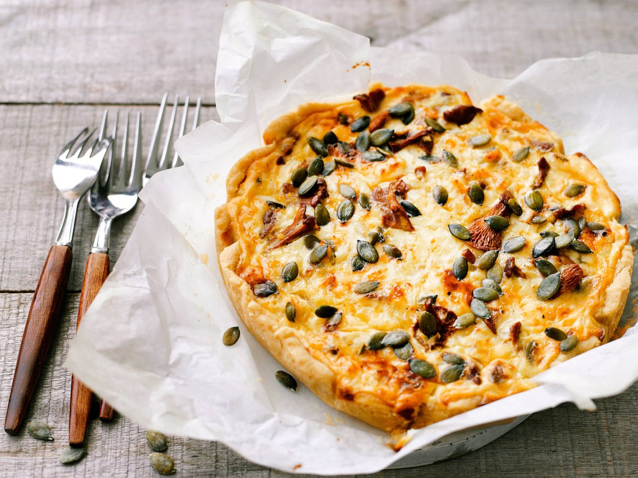 - Vatkaa muna, valkuainen ja ruokakerma tai kermaviili sekaisin. Lisää joukkoon vähän jäähtynyt sieni-sipuliseos, juusto raastettuna, mustapippuri, suola sekä halutessasi kurpitsansiemenet.