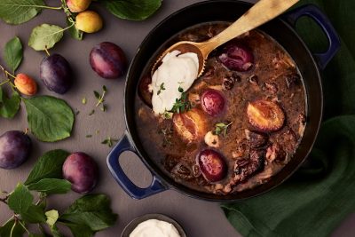 - Kypsennä uunissa 175 asteessa 2–3 tuntia. Lisää vettä tarvittaessa. Peitä tarvittaessa kypsymisen loppuvaiheessa kannella.