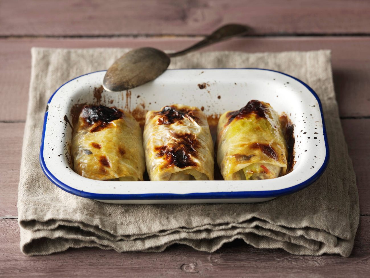- Kypsennä 225 asteessa 45 min, jotta kääryleet saavat väriä. Alenna lämpötila 175 ja kaada uunivuokaan liemikuutiolla maustettu keitinliemi. Peitä foliolla. Anna hautua n. 1 h 30 min.