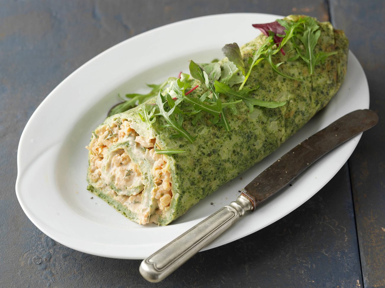 - Yhdistä täytteen ainekset keskenään ja levitä pohjalle. Kääri rullaksi.