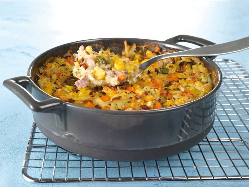 - Sekoita peruna-sipuli- ja kasvissekoitukset sekä mausteet voidellussa, laakeassa uunivuoassa. Lisää suikaloitu kinkku. Sekoita. Kaada päälle ruokakerma.