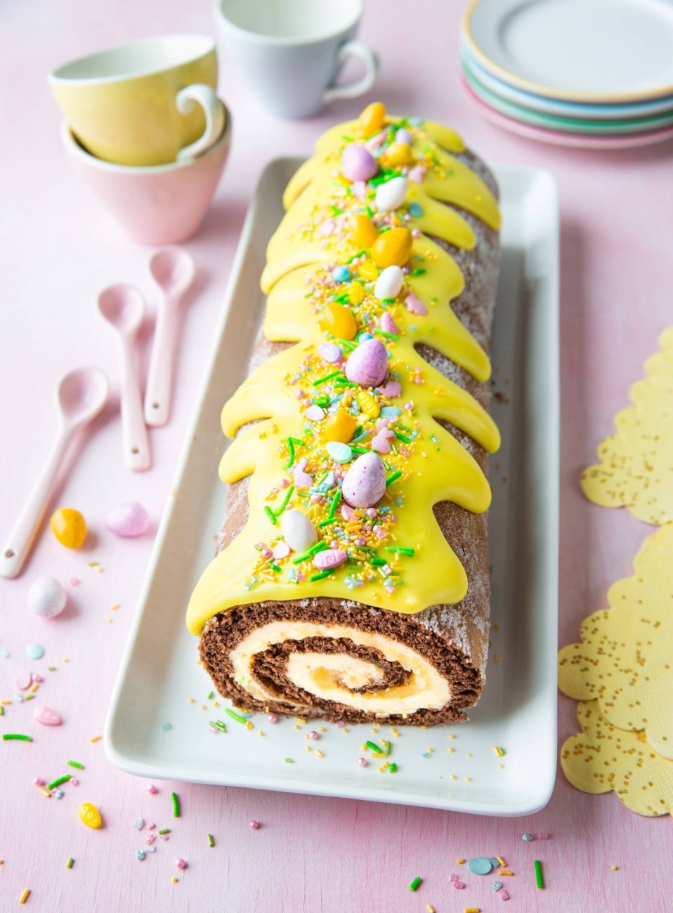 - Valuta kuorrutetta tortun pinnalle ja ripottele samantien päälle koristerakeita ja pääsiäismakeisia. Jos kääretortun on oltava gluteeniton, käytäthän koristelussa gluteenittomia tuotteita.