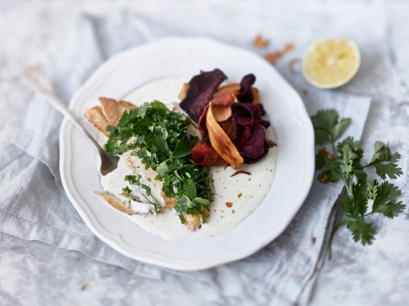 - Kaada lopuksi päälle kerma ja anna kiehahtaa. Viimeistele hienonnetulla korianterilla.