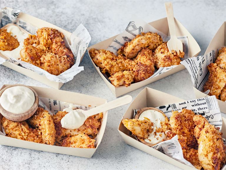 - Ota Koskenlaskija Ruoka & dippi lautaselle ja pyörittele fileet sulatejuustossa ja sen jälkeen korppujauhoissa.