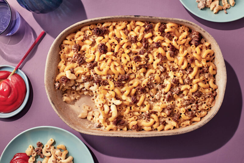 - Yhdistä tilavassa uunivuoassa makaronit ja jauhelihaseos. Kaada päälle juusto-lihaliemi.