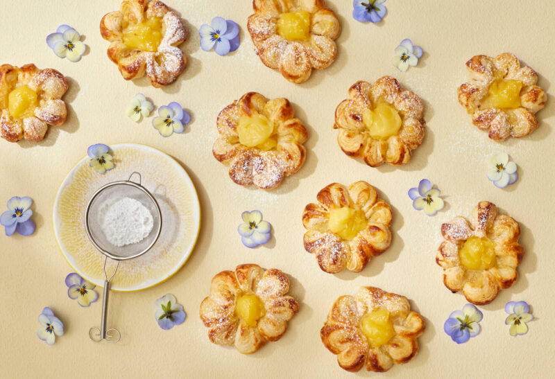 - Lisää noin 1/2 rkl vaniljakreemiä torttutaikinaneliön keskelle. Nosta neliön reunat ja sulje täyte taikinan sisään nyytiksi. Aseta nyytti leivinpaperin päälle pellille saumapuoli alaspäin.