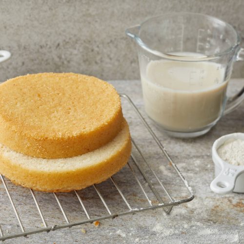 - Leikkaa jäähtynyt kakkupohja 3 osaan. Kostuta levyt vaniljamaidolla, kansi alapuolelta.