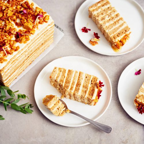 - Paista kakkupohja 175 asteessa kypsäksi n. 35 min. Mikäli paistat kakun pinnoitetussa vuoassa, uunin lämpötila saa olla alempi: alussa 175 asteessa 10 min, alenna sen jälkeen lämpötila 160 asteeseen ja paista vielä n. 25 min. Kumoa kakkupohja hieman jäähtyneenä.
