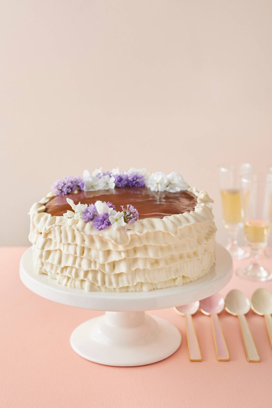 - Levitä kerroksiin kermavaahtoa ja marjaseosta. Kuorruta kakku lopulla kermavaahdolla ohuelti. Levitä kakulle lakat (tai puoliksi sulatetut lakat, joihin on sekoitettu lakkahillo).