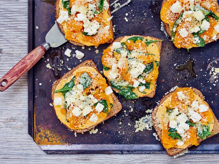 - Päällystä leivät kurpitsa-pinaattiseoksella ja salaattijuustolla. Lisää pinnalle juustoraaste (ja pinjansiemenet).