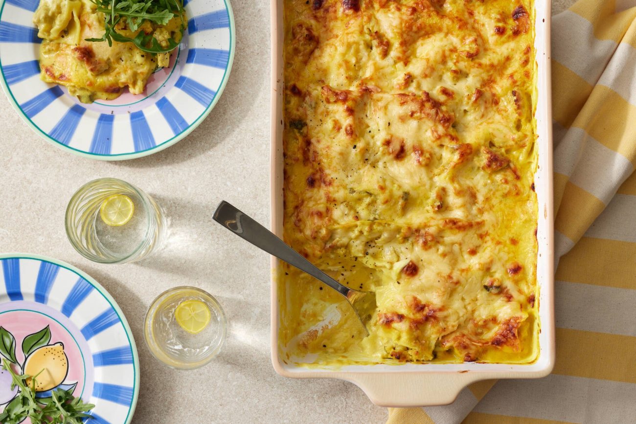 - Kokoa uunivuokaan (n. 20 x 30 cm) kerroksittain lasagnelevyjä ja kastiketta. Lusikoi väleihin mascarponenokareita. Jätä päällimmäiseksi kastiketta ja ripottele sen päälle juustoraaste.