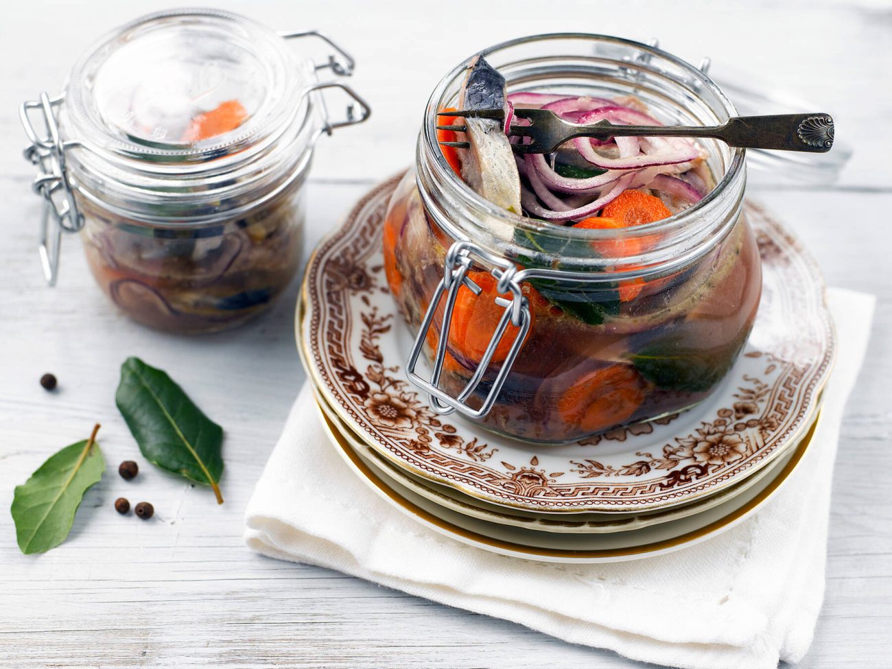 - Viipaloi porkkana ja sipuli. Lado lasitölkkiin kerroksittain mausteita, sillipaloja ja porkkana- sekä sipuliviipaleita. Kaada päälle liemi