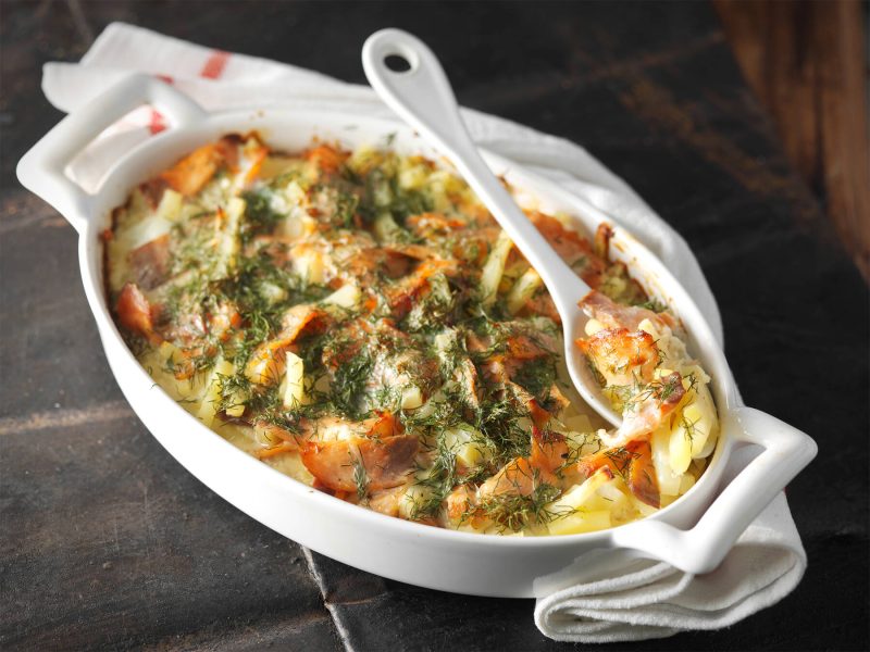 Lohi-perunavuoka on maukasta ja nopeaa arkiruokaa koko perheelle. Helppo vuoka paistuu uunissa ja on pinnaltaan kauniisti ruskistunut.
