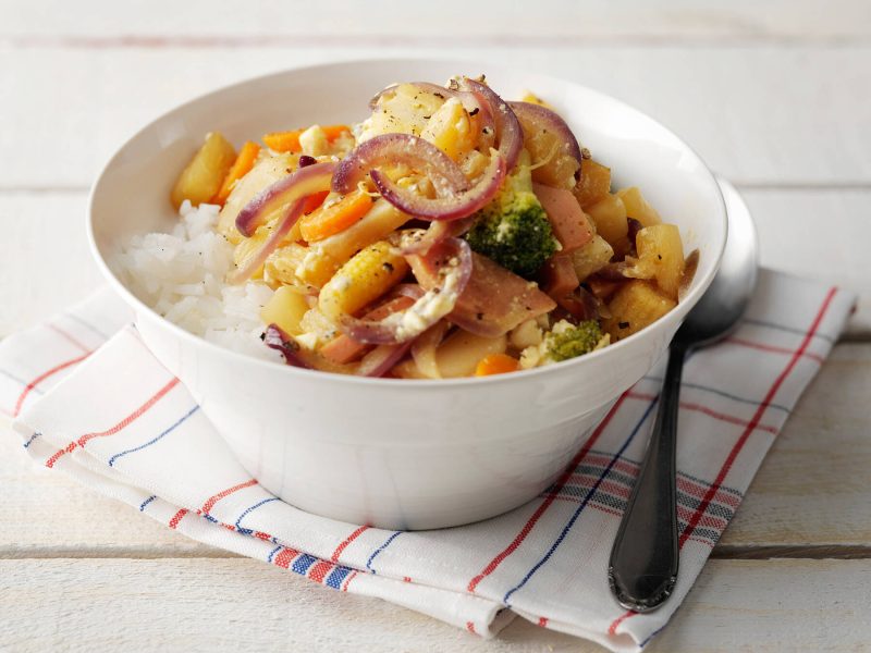 - Lisää suikaloitu makkara ja paista sekoitellen. Lisää vihannekset ja ananaspalat liemineen. Sekoita ja mausta chili- ja soijakastikkeilla. Anna kiehua alhaisella lämmöllä kannen alla muutama minuutti, kunnes kasvikset ovat sopivan kypsiä.