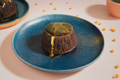 - Ennen tarjoilua: Vatkaa kerma, sokeri ja kaakaojauhe vaahdoksi. Lusikoi kakun pintaan. Koristele suklaakastikkeella: leikkaa purkin kulmaan saksilla 1 - 2 mm:n reikä. Pursota kuvioita kakun pintaan. Lisää mansikoita ja halutessasi mintun- tai sitruunamelissan lehtiä.