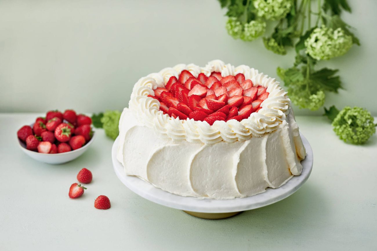 - Puolita mansikat ja asettele ne koko kakun päälle vinottain pystyyn kukkamaisesti.