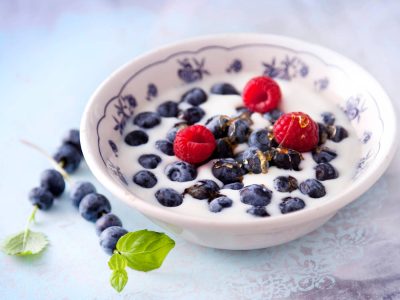 - Lisää rahkan joukkoon, marjat ja kuutioitu banaani.