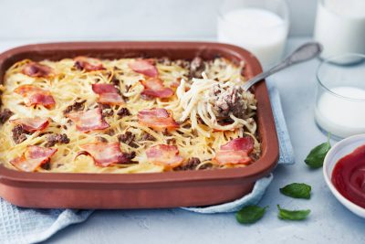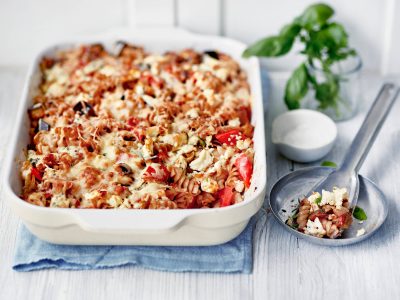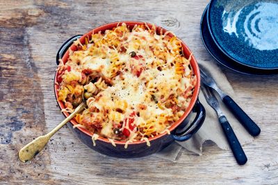 - Kaada kypsä pasta ja tomaatti-kinkkukastike voideltuun uunivuokaan. Sekoita kevyesti.