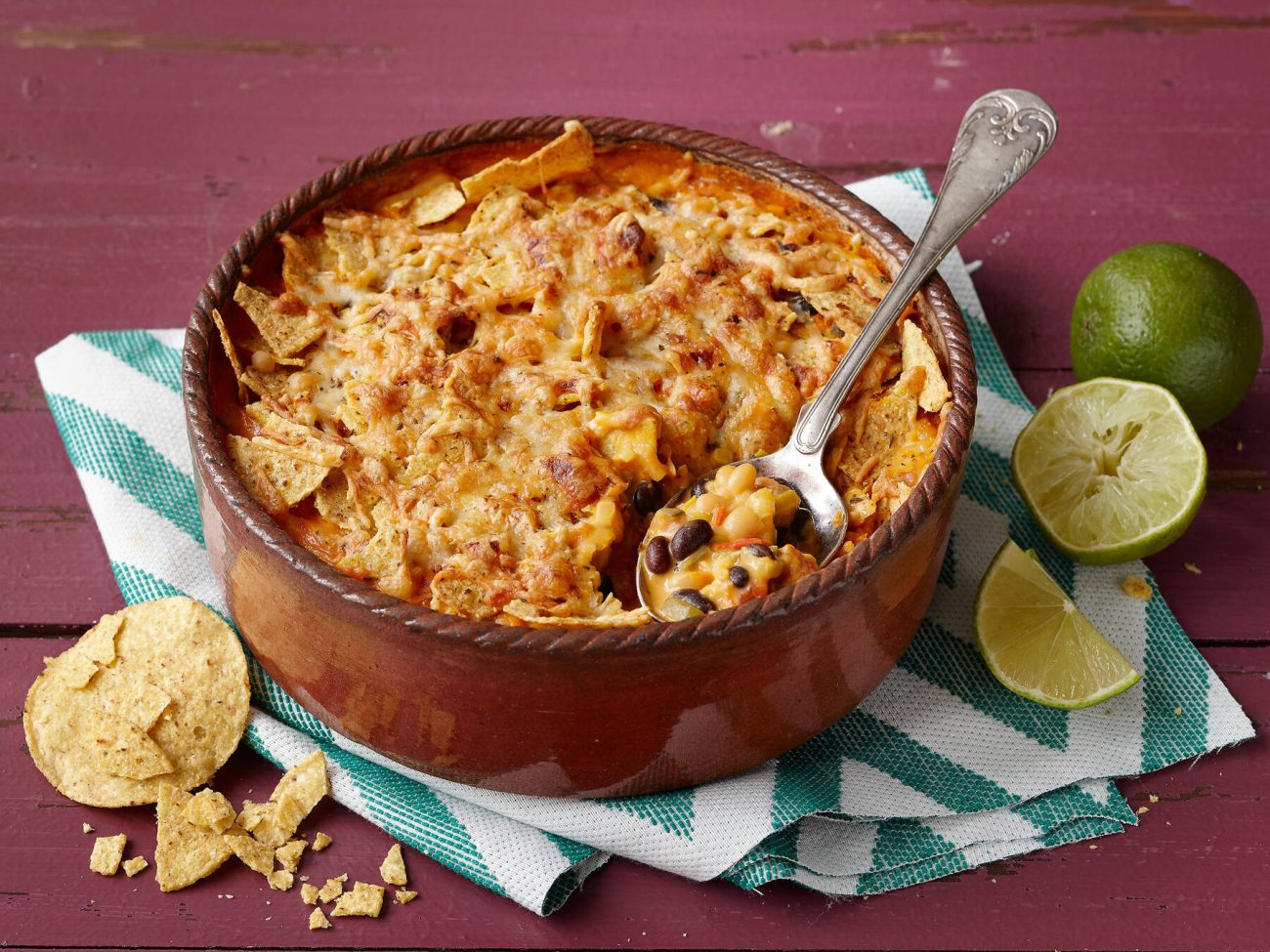 - Ripottele pinnalle kevyesti murskatut nachokset ja juustoraaste. Kypsennä uunin keskiosassa 225 asteessa 15 min. Nosta paistamisen loppuvaiheessa hetkeksi uunin yläosaan kauniin paistopinnan saamiseksi.