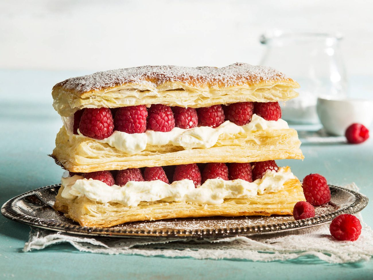 - Vaahdota tuorejuusto ja kerma. Leikkaa voitaikinalevyt vaakasuoraan kahtia. Jaa tuorejuustotäyte molempien levyjen pohjaosien päälle. Asettele vadelmat vaahdon päälle.