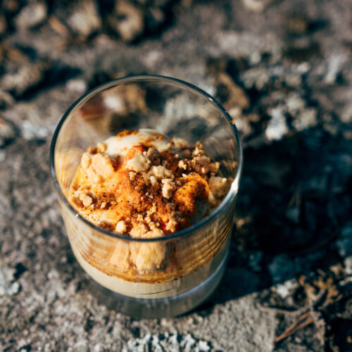 - Lisää pikakahvijauhe teesihdin läpi kermavaahtoon. Makeuta ruokosokerisiirapilla. Sekoita tasaiseksi.