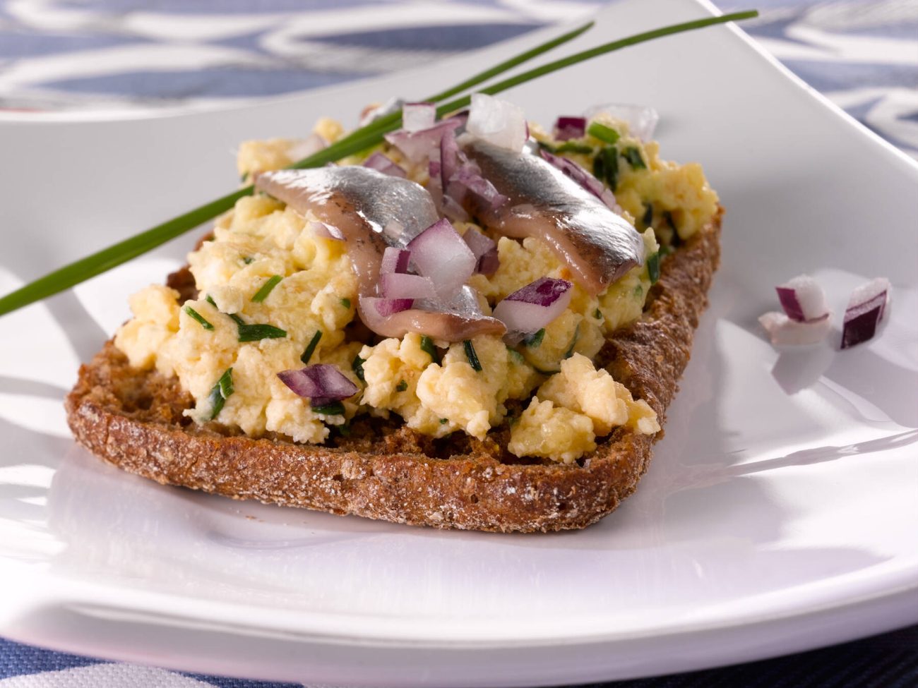 - Lisää valutetut anjovisfileet päälle. Koristele punasipulilla ja ruohosipulilla.