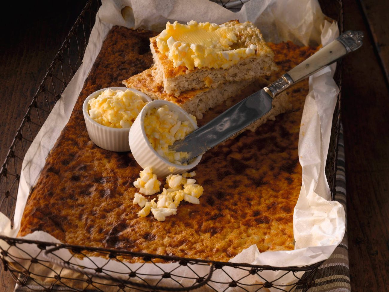 - Leikkaa rieska vähän jäähtyneenä paloiksi. Tarjoa munavoin kanssa