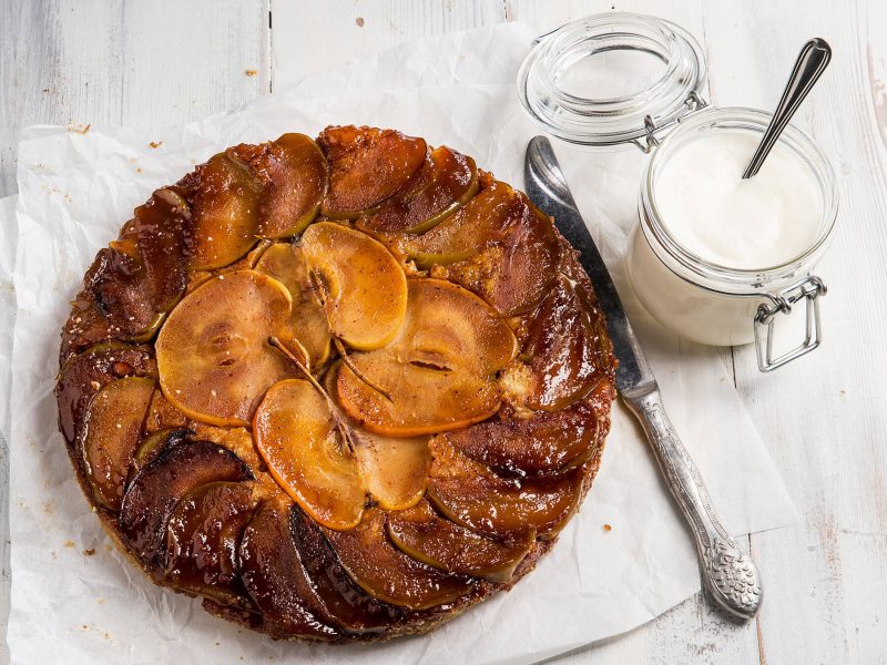 - Korppujauhota Ø 23 cm kakkuvuoan reunat, jätä pohja jauhottamatta. Asettele omenaviipaleet ensin vuoan keskelle ja sitten lohkot kauttaaltaan pohjalle. Kaada kaikki mehu pannulta omenalohkojen päälle.