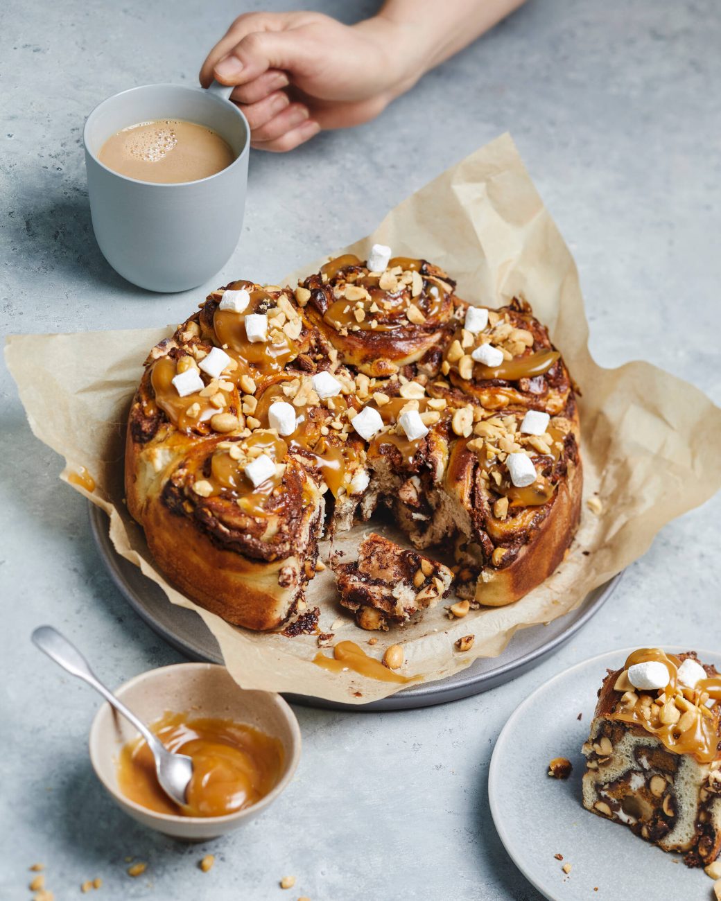 - Kauli taikina 30 x 60 kokoiseksi levyksi. Levitä nutella, rouhitut suolapähkinät, 3/4 vaahtokarkeista ja keskimuru levylle. Kääri rullaksi. Nipistele reuna hyvin kiinni. Leikkaa 10- 12 osaan, n. 5 cm levyisiksi paloiksi.