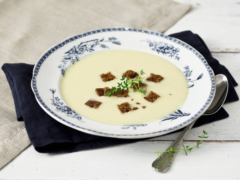 - Anna kiehua hiljalleen, kunnes peruna on kypsää. Poista timjaminoksat keitosta ja soseuta sauvasekoittimella tasaiseksi.