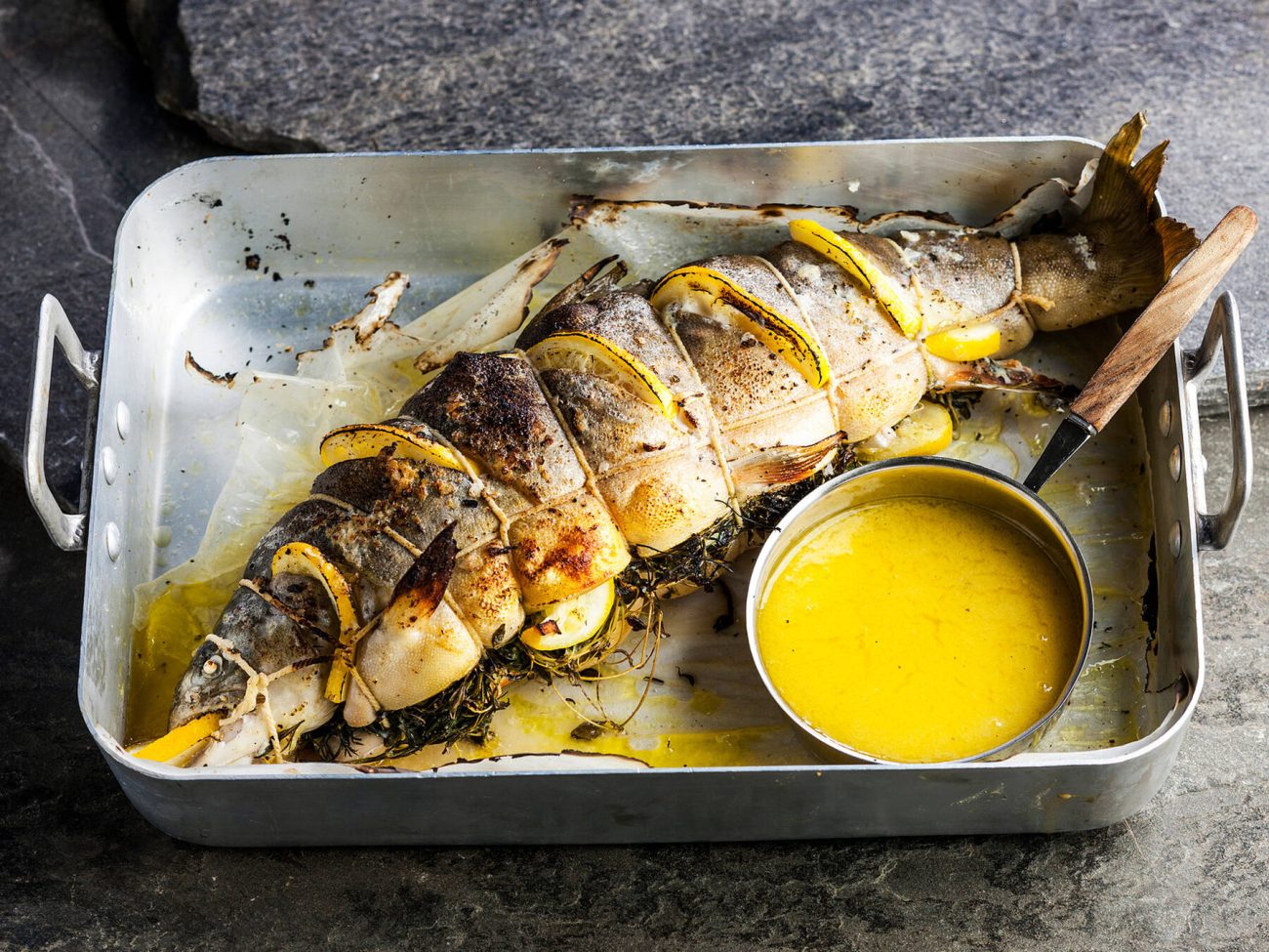 - Täytä kala sitruunalla, timjamin- ja tillinoksilla. Lisää myös kalan kylkiviiltoihin sitruunaviipaleet.