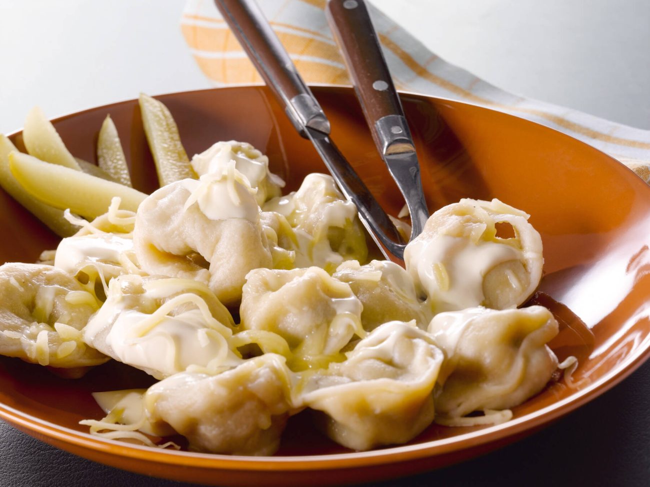 - Mittaa vesi (mielellään laakeaan) kattilaan. Lisää mausteet. Kuumenna kiehuvaksi. Keitä pelmenit muutamassa erässä kypsiksi, n.12 min. Pidä vesi kiehuvana koko ajan. Käännä pelmenit kypsennyksen puolivälissä. Nosta reikäkauhalla tarjoilukulhoon. Lisää pelmeneille hiukan Oivariinia, etteivät ne tartu toisiinsa. Pidä kuumina.