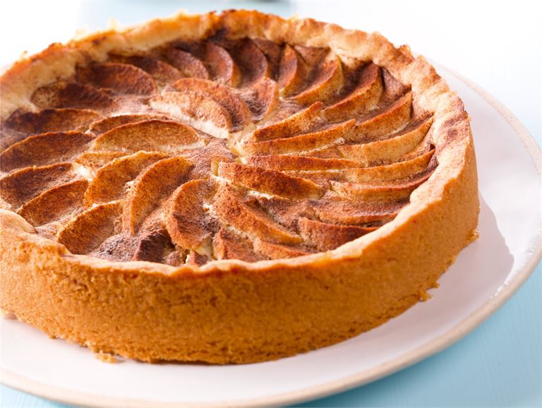 - Kuori omenat ja poista niistä siemenkodat. Leikkaa omenat ohuiksi viipaleiksi. Lado ne täytteen päälle ympyrän muotoon. Sirota päälle kanelia ja sokeria.