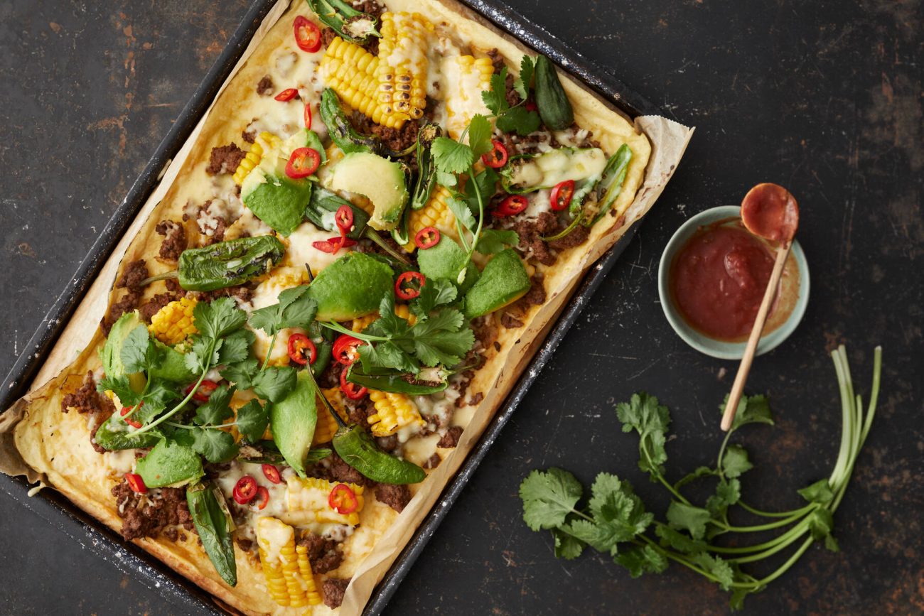 - Lisää kypsän pannarin pintaan jauheliha-sipuliseos, paprikat, maissit sekä juustoraaste. Jatka paistamista vielä 10 min.