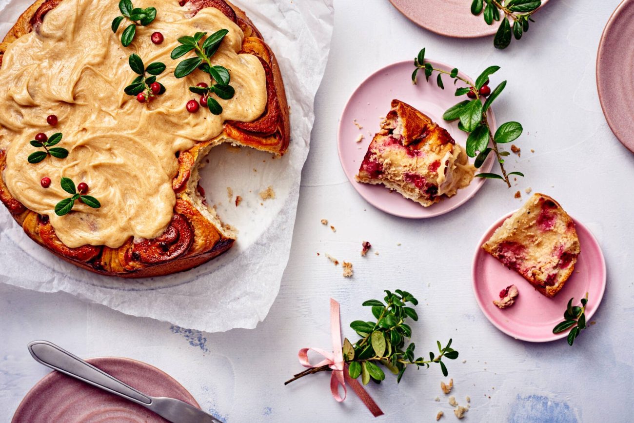 - Kauli taikina kevyesti jauhotetulla alustalla noin 35 x 40 cm:n levyksi. Notkista tuorejuusto ja mausta piparkakkumausteella. Levitä tuorejuusto levylle. Ripottele puolukat päälle. Kääri napakaksi rullaksi ja leikkaa 12 osaan.