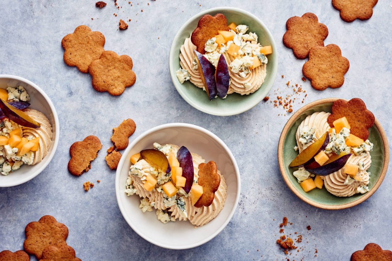 - Pursota vaahtoa tarjoiluastioihin ja ripottele päälle AURA murua. Viimeistele annokset piparkakuilla, luumulla ja/persimonilla.