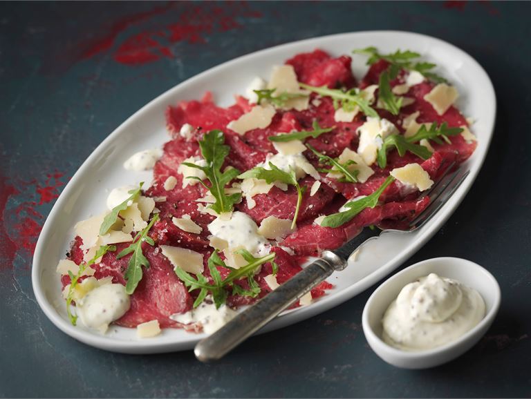 - Asettele lihaviipaleet lautaselle vieri viereen ja pirskottele sinappi-smetanaa lihan päälle. (Voit tarjota kastikkeen myös erikseen.) Rouhi pinnalle mustapippuria. Koristele Forte-lastuilla ja rucolalla.