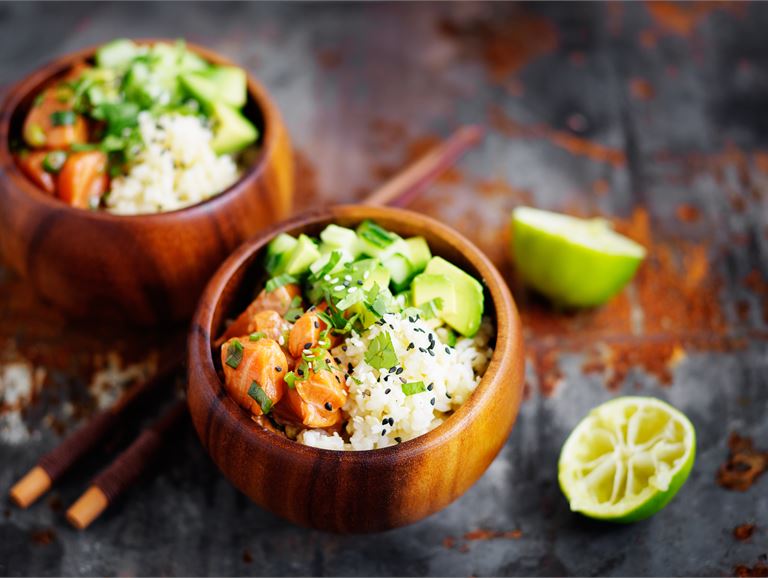 - Nosta riisi annoskulhoihin. Asettele päälle lohi, avokado- ja kurkkukuutiot. Viimeistele korianterilla.