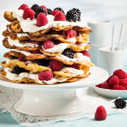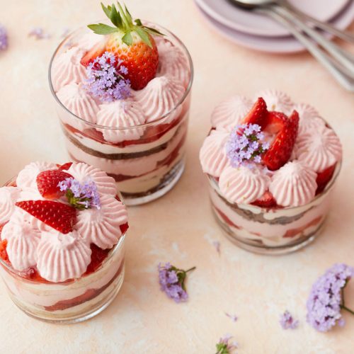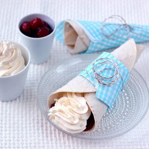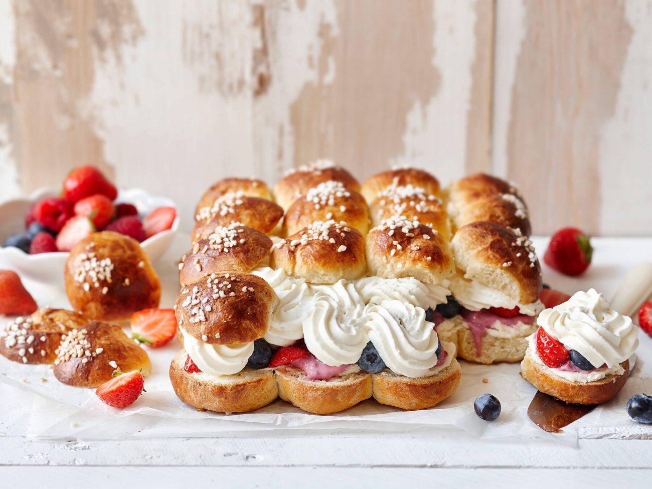 - Vaahdota kerma, mausta sokerilla. Pursota tai lusikoi kermavaahto marjojen päälle. Aseta pullakansi paikoilleen.