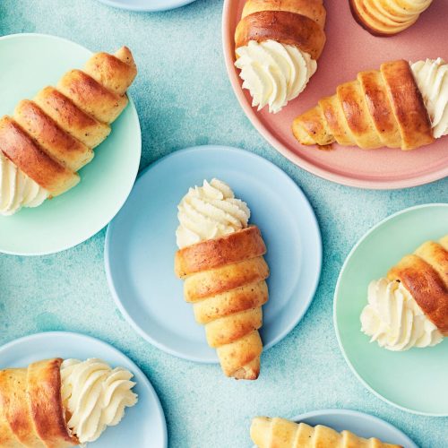 - Sekoita täytteen ainekset keskenään, voi huoneenlämpöisenä. Levitä täyte levyn pintaan. Kierrä pitkältä sivulta rullaksi. Leikkaa rulla saksilla keskeltä pituus-suunnassa puoliksi, mutta jätä päästä muutaman sentin matkalta kiinni.