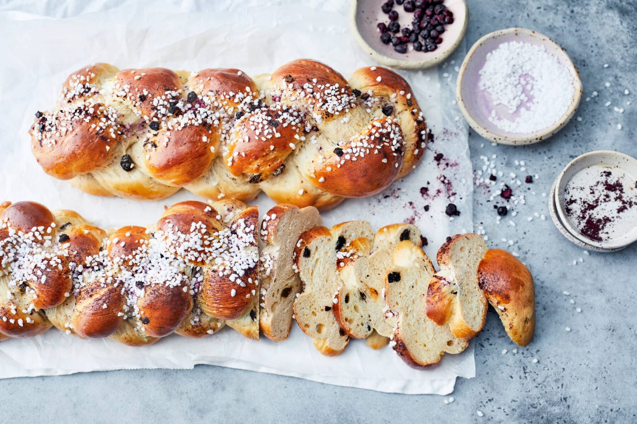 - Voitele rikotulla kananmunalla. Sekoita raesokerin joukkoon mustikkajauhetta tai murennettua kuivattua mustikkaa. Ripottele pitkoille.
