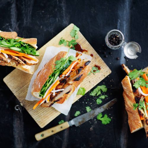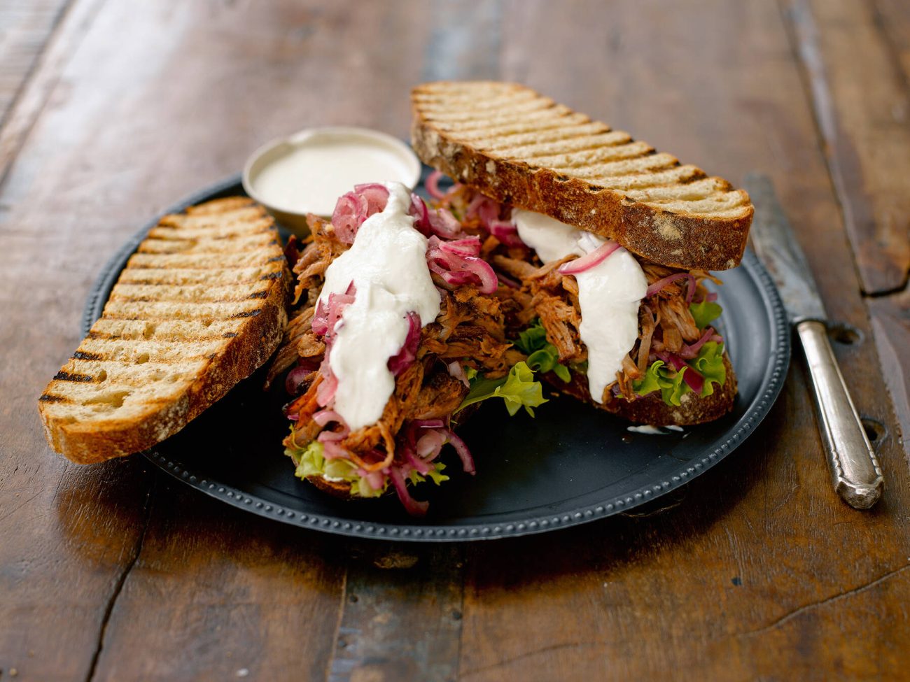 - Asettele salaatinlehdet, nyhtöpossu ja marinoitu punasipuli neljän leivän päälle. Lusikoi päällimmäiseksi piparjuurikastiketta. Nosta loput leipäviipaleet kansiksi.